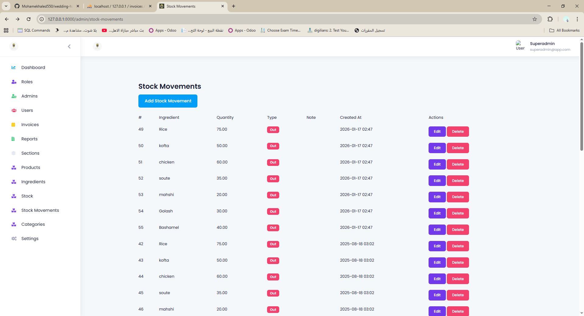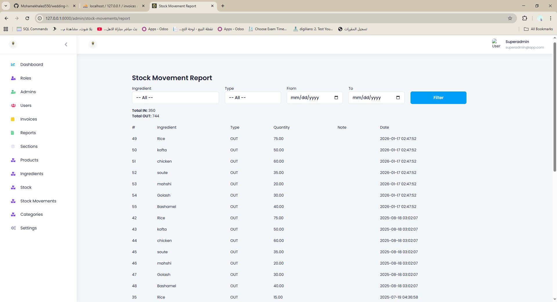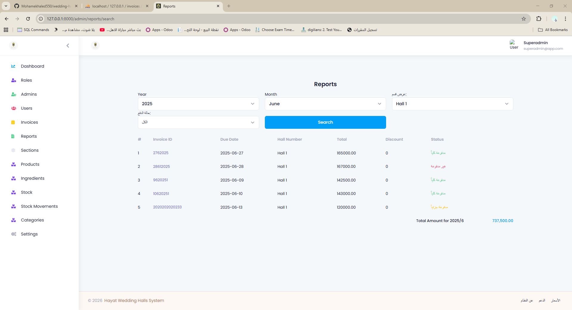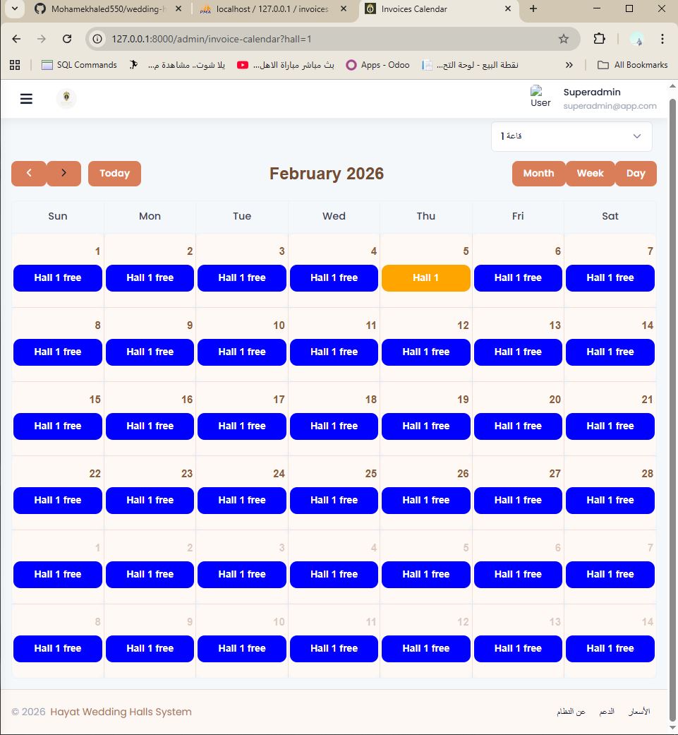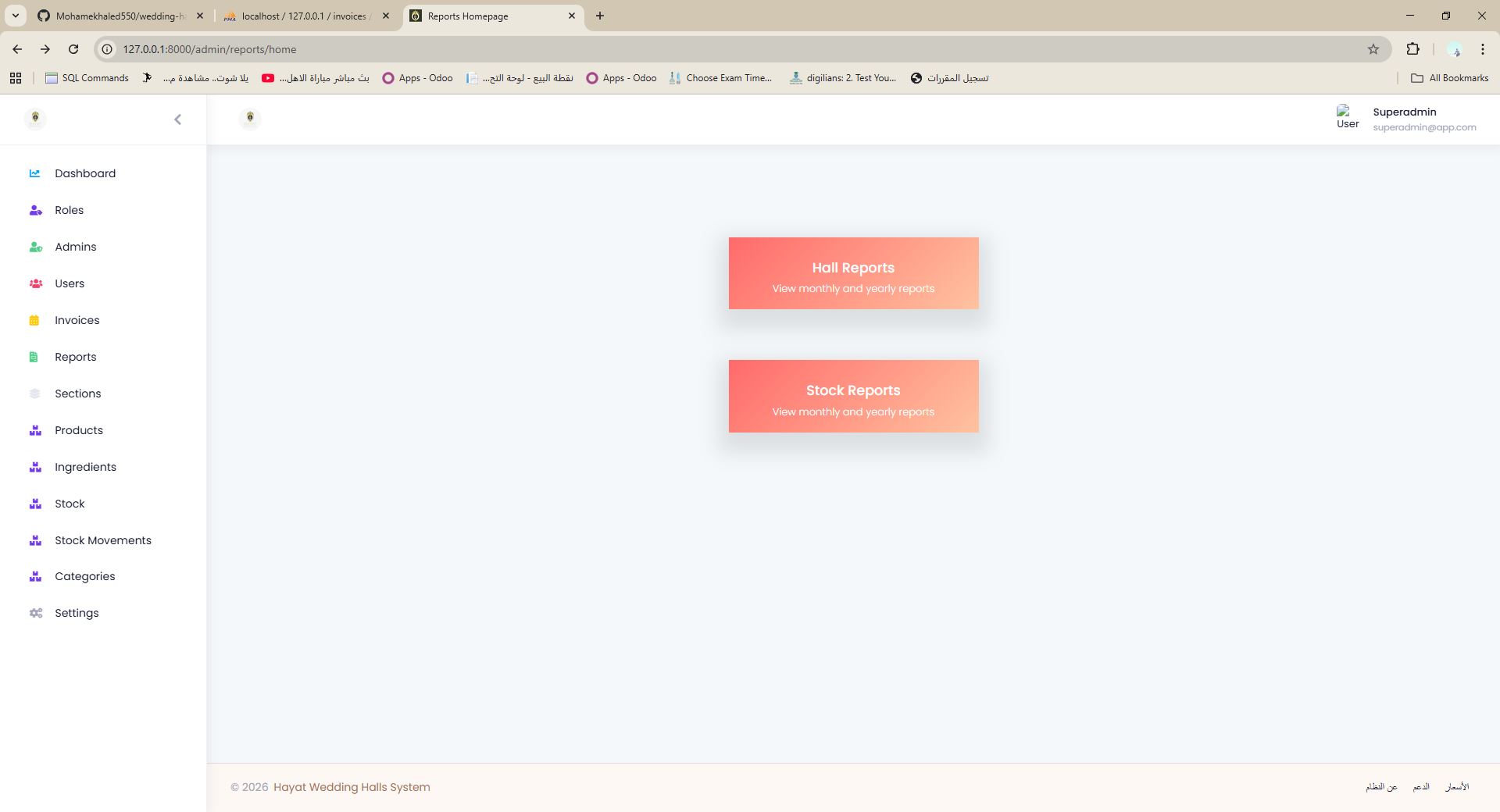 نظام ERP لإدارة المخازن والحجوزات والمدفوعات والفواتير والتقارير والطباعة لقاعات المناسبات والضيافة.